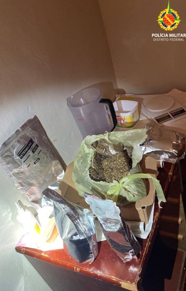 Ao chegarem ao endereço, os policiais encontraram 2kg de maconha, balanças de precisão, objetos utilizados para refino de drogas e 2,5kg de tetracaína, analgésico indicado para o tratamento de inflamações nos olhos, nariz ou garganta.