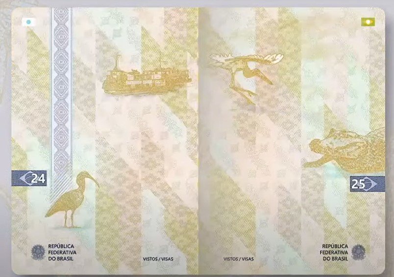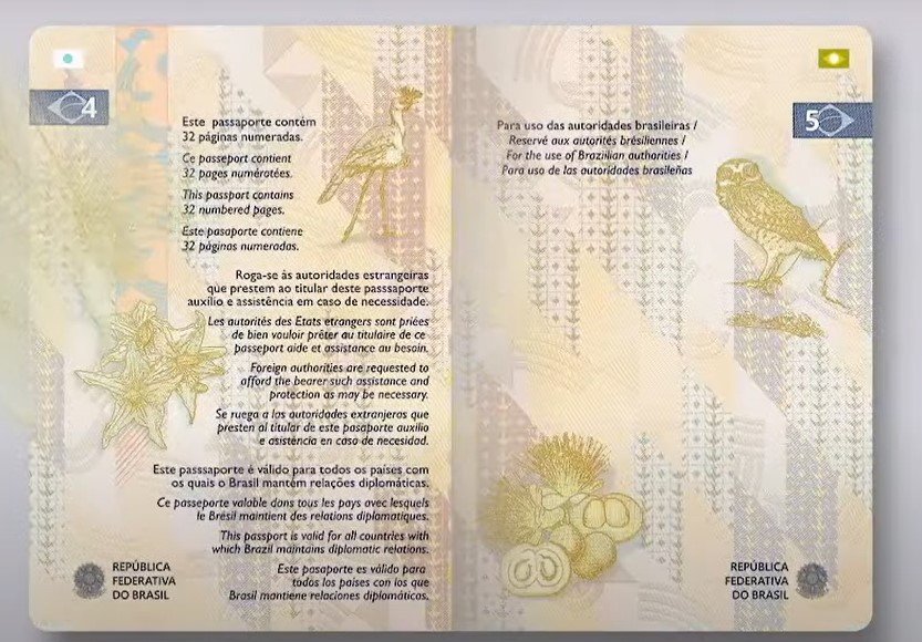 Na capa, a novidade é a estilização da bandeira do Brasil, apresentada em relevo seco timbrado na lateral direita do documento. Nas páginas numeradas do novo passaporte há um aumento do números de marcas d’água, que passou de uma para 13 ilustrações diferentes, que representam a flora e a fauna dos principais biomas do país.