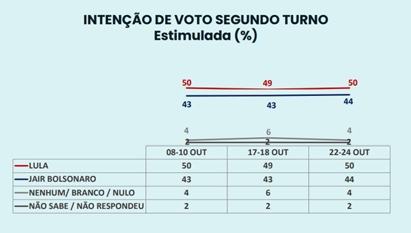 Em relação ao último levantamento, divulgado em 18 de outubro, os dois candidatos oscilaram um ponto dentro da margem de erro. Lula passou de 49% para 50%, enquanto Bolsonaro saiu de 43% para 44%.
