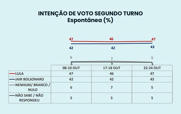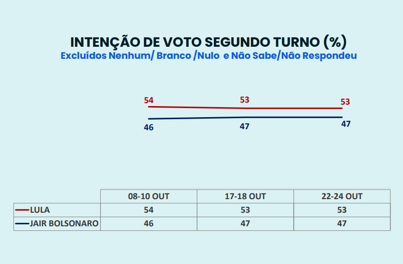Em comparação com a última sondagem do instituto, os candidatos mantiveram os percentuais. No dia 18 de outubro, Lula também tinha 53% ante 47% de Bolsonaro, enquanto, em 11 de outubro, o petista marcou 54%, e o postulante à reeleição somou 46% dos votos válidos.
