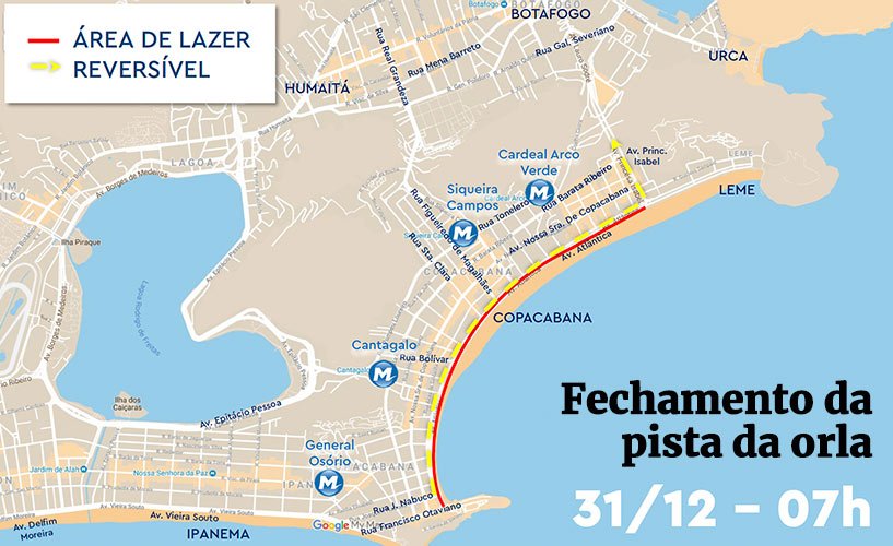 O metrô também não vai funcionar normalmente. As atividades serão encerradas às 20h do dia 31/12. A partir das 22h, nenhum carro poderá acessar Copacabana, nem mesmo os moradores do bairro, que só poderão sair ou entrar em casa a pé.