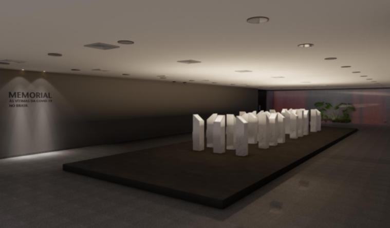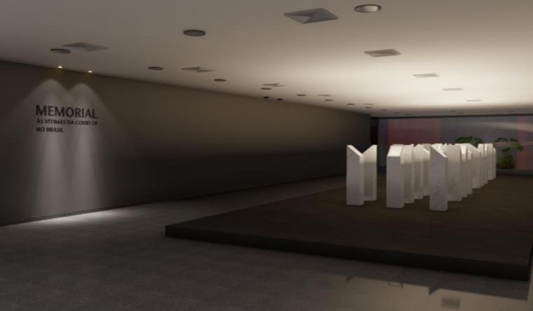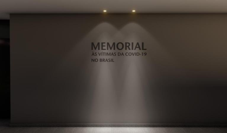 Para maior destaque das colunas e da luz natural que ilumina a sala, a parede do memorial será pintada de grafite e receberá um letreiro em metal escrito “Memorial às Vítimas da Covid-19 no Brasil”.
