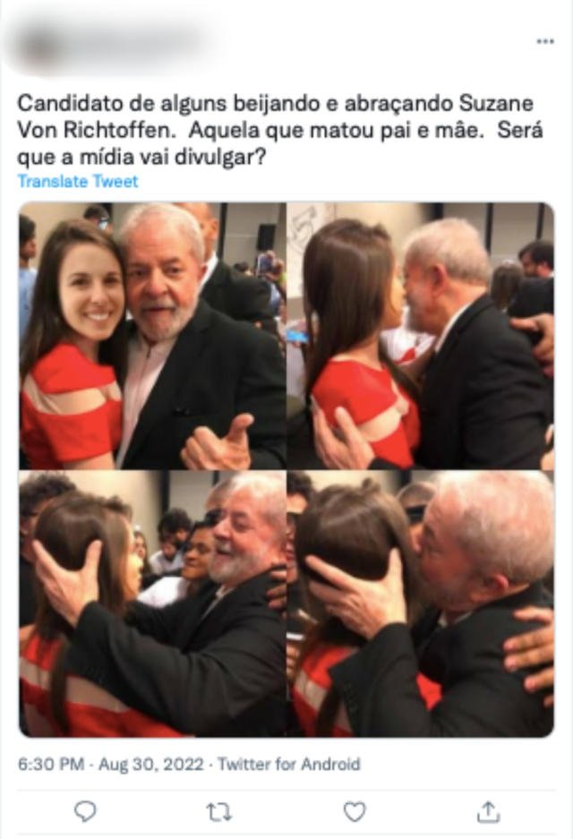 Outro tema que surgiu nas pesquisas liga o candidato a Suzane von Richthofen, condenada a 39 anos de prisão pelo assassinato dos pais, em 2002. Uma montagem inverídica, com quatro fotos dos dois, passou a circular nas redes. O rosto de Suzane, na verdade, foi inserido sobre o da jornalista Patrícia Lélis.